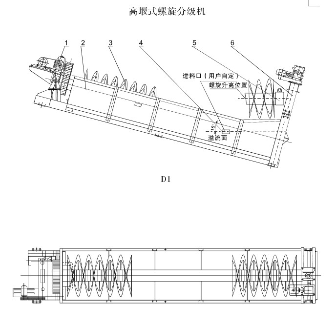FG螺旋分級機(jī)結(jié)構(gòu)及原理FC螺旋分級機(jī)大致相同(結(jié)構(gòu)示意圖)。FG螺旋分級機(jī)的溢流堰位置高于螺旋軸下端的軸承中心,但低于溢流螺旋的上緣,具有一定的沉降區(qū)域,故適用于粗粒洗砂。而FC螺旋分級機(jī)溢流端的整個螺旋都浸沉在沉降區(qū)域液面下,其沉降區(qū)具有較大面積和深度,故適用于細(xì)粒洗砂。砂漿從位于沉降區(qū)中部的進(jìn)料口入水槽,傾斜安裝的水槽下端是砂漿分級沉降區(qū),螺旋低速轉(zhuǎn)動,對砂漿起攪拌作用,使輕細(xì)顆粒泥懸浮到上面,流到溢邊堰處溢出,粗重顆粒砂沉降到槽底,由螺旋輸送到排料口排出。